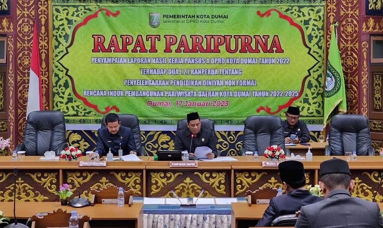 Rapat Paripurna dengan agenda penyampaian laporan hasil kerja Pansus A DPRD Kota Dumai Tahun 2022 terhadap Dua Ranperda Tentang Penyelenggaraan Pendidilan Diniyah Non Formal dan Rencana Induk Pembangunan Pariwisata Daerah Kota Dumai Tahun 2022-2025.