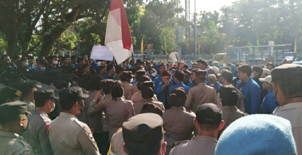 Puluhan aparat berjaga di depan gerbang gedung DPRD Riau. Selain itu mobil water canon juga disiagakan oleh Polresta Pekanbaru di lokasi unjuk rasa.